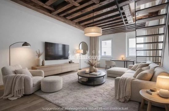Appartement en dernier étage – Haut Marais Paris 3ème - rue des Gravilliers - Dans un quartier prisé du Haut Marais, situé dans un bel immeuble ancien du 18ème, nous vous proposons un appartement en duplex situé au 4ème étage par escalier, d’une superficie de 60 m2 (56,21 m2 Loi Carrez), comprenant au premier niveau une entrée avec dressing, un séjour, une cuisine semi-ouverte, une salle de bains avec WC.